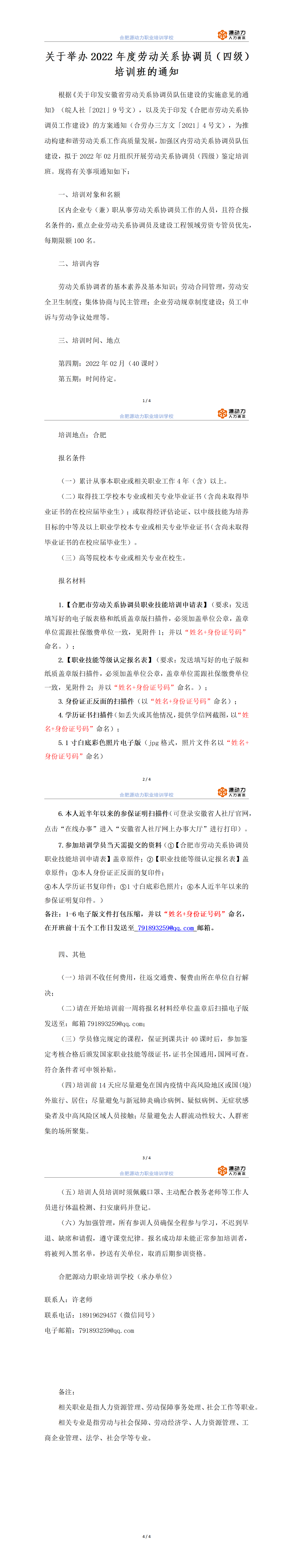 關于舉辦 2022年度勞動關系協調員(四級) 培訓班的通知